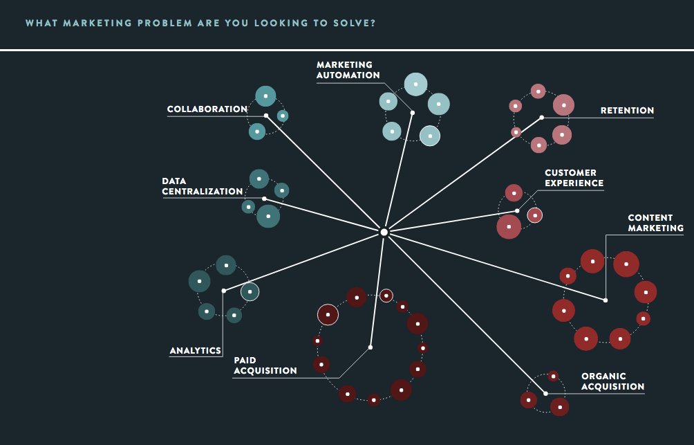Για όσους ψάχνουν ένα αποτελεσματικό εργαλείο για να ολοκληρώσουν μια δουλειά ή για να λύσουν ένα πρόβλημα που τους απασχολεί, συνιστούμε να ρίξουν μια ματιά στο Growthverse: μια free, διαδραστική online απεικόνιση της σύγχρονης τεχνολογίας στο marketing, που επικεντρώνεται σε επιχειρηματικούς προβληματισμούς. Η πλατφόρμα αυτή καθοδηγεί τους marketers σε συγκεκριμένα κομμάτια τεχνολογίας marketing, που στοχεύουν στην επίλυση αυτών των προβλημάτων.